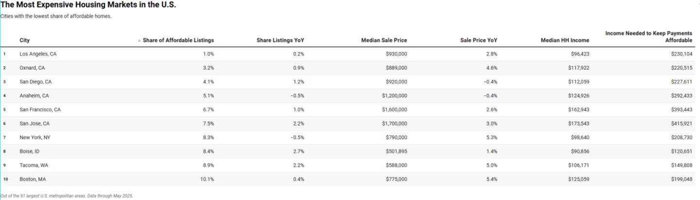 Rankings are based on housing affordability among the 91 largest U.S. metropolitan areas (“cities”). Data comes from Redfin through May 2025.