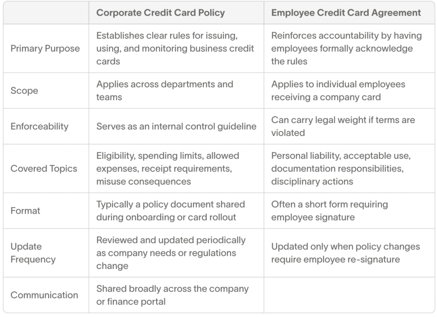 The biggest difference between a corporate credit card policy and an employee credit card agreement comes down to scope. A policy applies to your entire organization. It sets the rules for how cards should be used across teams. An agreement applies to the individual. It confirms that each employee understands those rules and agrees to follow them.