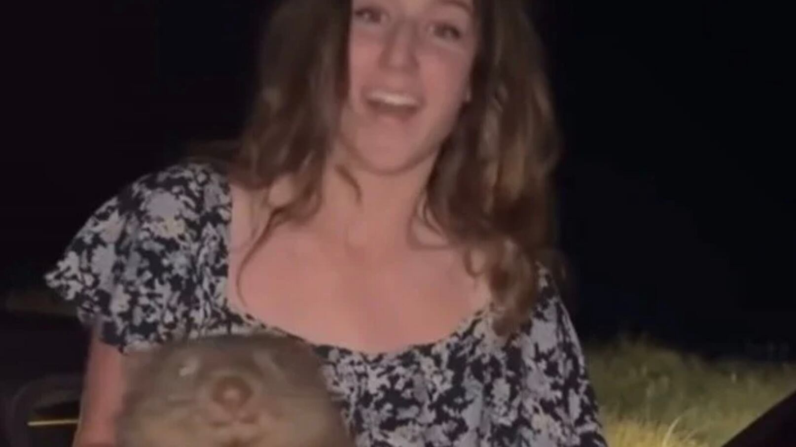 “I caught a baby wombat!” Jones says to the camera as she is being filmed by an unidentified man who can be heard laughing in the background.