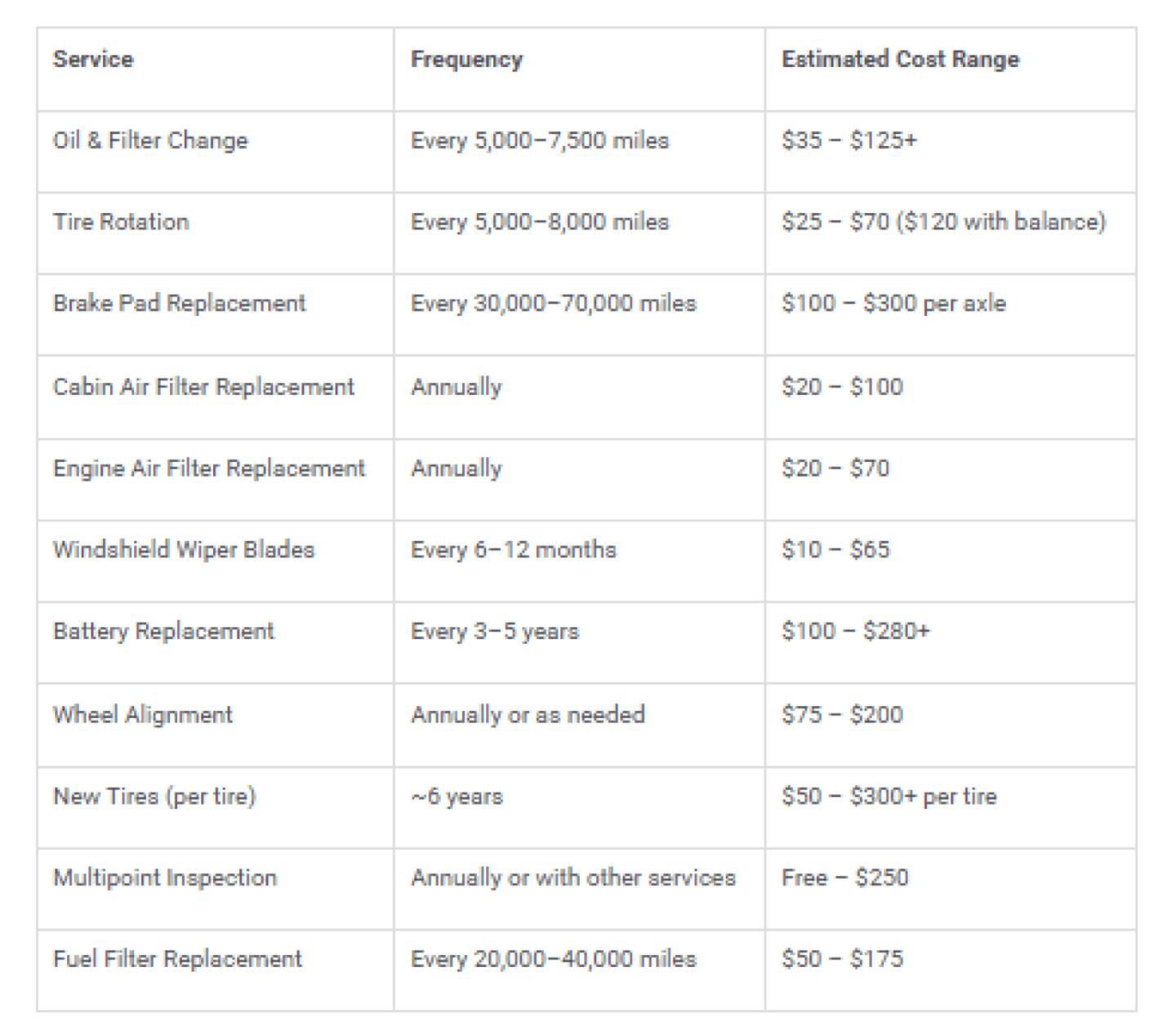 Note that this value is for routine maintenance and minor repairs for newer vehicles. Typical driving conditions and proactive maintenance habits may vary for each car owner. The estimated range may go up to $1,200–$1,800/year for major repairs or vehicles with higher mileage or older ones. It is often difficult for older vehicles to acquire parts, and unexpected repairs may be required.