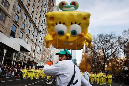 Macy's Thanksgiving Day Parade NEW YORK, NEW YORK - NOVEMBER 27: The Spongebob balloon joins the 99th Macy’s Thanksgiving Day Parade as it makes its way through Manhattan towards Macy's flagship store on November 27, 2025, in New York City. Celebrating its 99th year, the parade includes marching bands, musical and dance performances, and iconic character balloons. (Photo by Spencer Platt/Getty Images) (Spencer Platt/Getty Images)