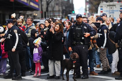 Macy's Thanksgiving Day Parade NEW YORK, NEW YORK - NOVEMBER 27: Police keep watch as the 99th Macy’s Thanksgiving Day Parade makes its way through Manhattan towards Macy's flagship store on November 27, 2025 in New York City. Celebrating its 99th year, the parade includes marching bands, musical and dance performances, and iconic character balloons. (Photo by Spencer Platt/Getty Images) (Spencer Platt/Getty Images)