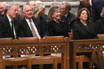 Dick Cheney funeral: Former Vice President Kamala Harris, right, attends the funeral service for Dick Cheney at the Washington National Cathedral. (SAUL LOEB/AFP via Getty Images)