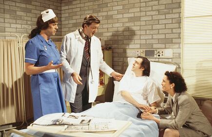 Through the years Comic actors (L-R) Hugh Laurie, Stephen Fry, Kevin McNally and Fiona Gillies in a hospital sketch from the BBC television series 'A Bit of Fry and Laurie', March 22nd 1994. (Photo by Don Smith/Radio Times/Getty Images) (Radio Times/Getty Images)