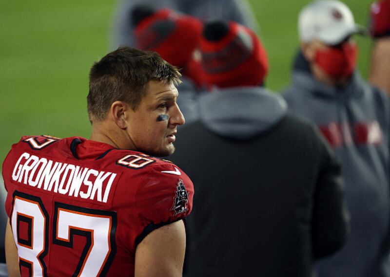 Through the years LANDOVER, MARYLAND - JANUARY 09: Tight end Rob Gronkowski #87 of the Tampa Bay Buccaneers watches from the sidelines prior to the game against the Washington Football Team at FedExField on January 09, 2021 in Landover, Maryland. (Photo by Patrick Smith/Getty Images) (Patrick Smith/Getty Images)